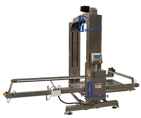 人工用地牛將整托盤空罐運(yùn)至指定位置(碼垛方式為罐口向上),點(diǎn)動啟動按鈕,系統(tǒng)會自動通過光電檢測確定空罐托盤高度,根據(jù)后面緩存皮帶對罐子的需求,將一層空罐通過刮板推至緩存面板上,然后再調(diào)整上下高度與后道的緩存皮帶進(jìn)行高度對接,再將空罐送至緩存皮帶上待用