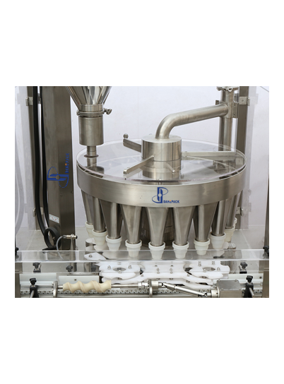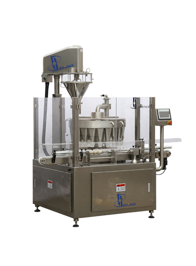 旋轉(zhuǎn)式充填機(jī)具有很高的生產(chǎn)效率和生產(chǎn)速度,即使在非常苛刻的生產(chǎn)要求下,旋轉(zhuǎn)式充填系統(tǒng)將物料連續(xù)的分發(fā)到旋轉(zhuǎn)的多工位漏斗里,瓶子在漏斗下,一個(gè)瓶子對(duì)應(yīng)一個(gè)漏斗,不等距螺旋和星形轉(zhuǎn)盤(pán)將瓶子均勻的對(duì)應(yīng)到每一個(gè)漏斗下同步旋轉(zhuǎn)并振動(dòng),螺桿計(jì)量機(jī)精確的將物料充填到漏斗里,然后物料在星形轉(zhuǎn)盤(pán)旋轉(zhuǎn)四分之三圈的時(shí)間內(nèi)從漏斗落到瓶子里,特別適用于瓶子口徑小,但包裝速度要求高的各種粉末和小顆粒物料。
