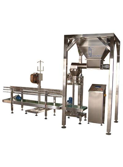 加配皮帶輸送機(jī)、縫包機(jī)、折邊機(jī)或熱合機(jī)等可以成為成套包裝系統(tǒng)。