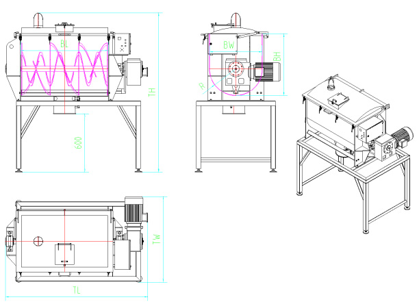 該機型為臥式筒體,單軸雙螺帶對稱分布結構?;旌蠙C筒體為U型,在頂蓋或筒體上部有進料口,根據(jù)用戶需要其上可裝噴霧加液裝置。筒體內裝有單軸轉子,轉子是由軸、橫撐及螺帶組成。